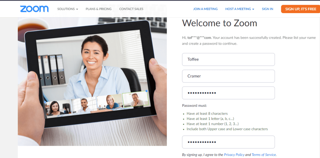 The main sign up page asks for your first and last names and to choose a password. The password must have at least 8 characters and contain at least 1 lowercase letter, 1 uppercase letter and one number. Special characters are allowed but not mandatory to include.