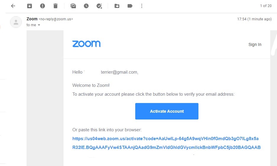 Next, in a separate tab on your browser, go to your email account, and open the email from Zoom and select the “Activate your Account” button.