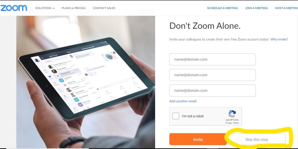 You will be prompted to invite other users by inputting their email addresses. This step is not necessary, and you can safely choose “Skip this Step” (circled below).