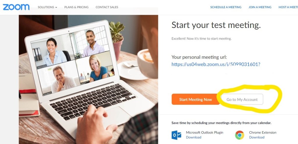 As a next step, Zoom will prompt you to start your first meeting. Unless you happen to have scheduled one at this time, it’s unlikely you’ll need to do this. Instead you can go to your account (circled below) and add a photo. This will be shown, for example, when your video is set to “off”. You can upload one from your files. Otherwise, note down your login details where appropriate and close the browser tab.