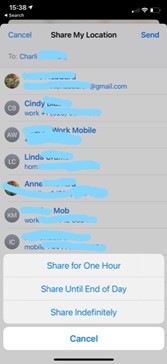 Once you choose a contact with whom to share your location, you will be prompted to choose for how long to make your whereabouts visible to them. Your choices are: