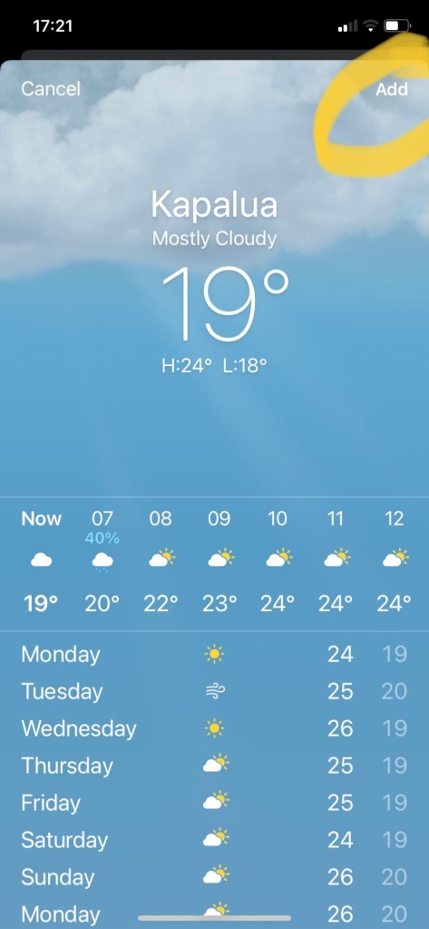 Once you’ve got the right town (why not make yourself jealous with Kapalua Maui, Hawaii?), be sure to select “Add” which is in top right: