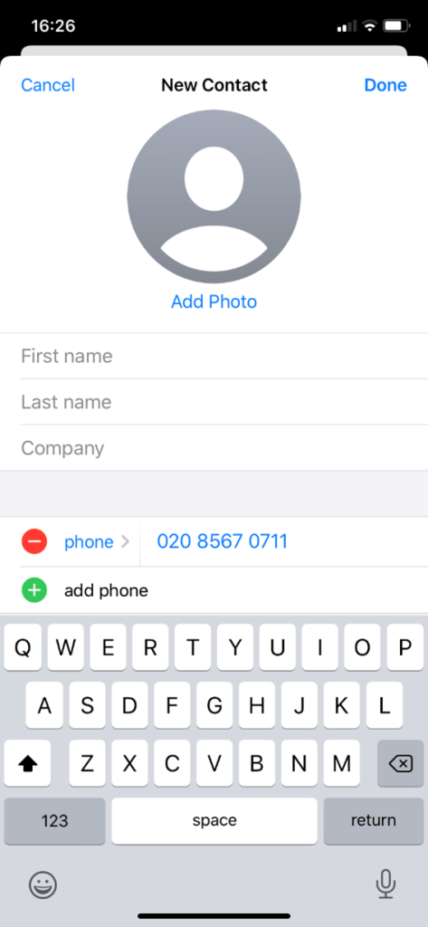 Once you tick “+”, you will get a screen with blank fields for you to complete. You only need fill in the fields that you want (see below, left) by ticking on the desired field (eg “First name”) and using the typing bars that pop up. You can leave the fields blank that you don’t know or care about, but be sure to hit “Done” (see below circled yellow, right) for your changes to be saved! Top tip: make searching for your contacts easy by inputting information that you can easily search by. For example if you occasionally use a dog walker named “Mark” but don’t know or can’t remember his last name, simply put “dog walker” under the Last Name or Company field. That way later you will be able to search your contacts by typing in “dog walker”.