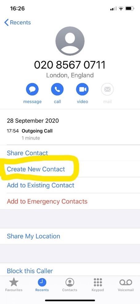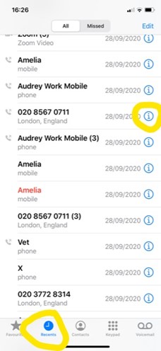To create a new contact from a number you have called or has called you, go into the phone book and select “Recents” (see yellow circled below, left). Then select the circled “i” to the right of the number you’d like to save (same screenshot, left, mid-screen).