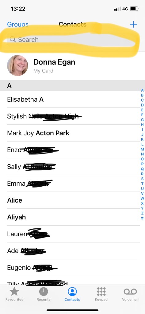 Now find the Search bar near the top (see yellow highlighted area of image below) and type in whichever part of the person’s or company’s information you can remember. For example if you can’t remember the full name of your favorite nail salon, just type in “nail”, and it should come up as long as you’ve included the word “nail” when you saved the contact.