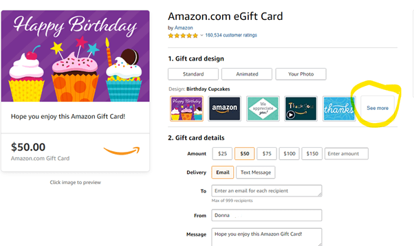 As you will see, the page opens with default options already selected. Don’t worry, it’s super easy to change these. First select between an animated (moving) design, one with a photo that you upload or one of Amazon’s many standard (non-animated) designs. There are several options for most occasions. If you don’t see what you like in the options on your screen, simply tick the box on the right (circled) that says “See More” and the designs will rotate in a carousel. Once you see one you like, click on it, and it will appear in a larger box on the left. If you change your mind, simply click on another design from the carousel of options.