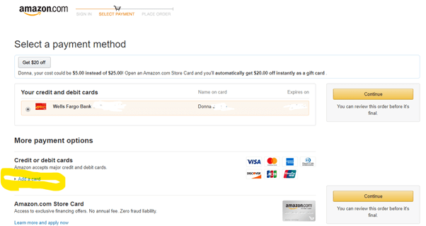If you already have used one or more payment card options on your Amazon account previously, they should be shown on this page. Simply tick the one you’d like to pay with and click either of the “Continue” buttons. If you would like to pay with a different card or method, then select “Add a card” (circled below) under the header “More Payment Options”.