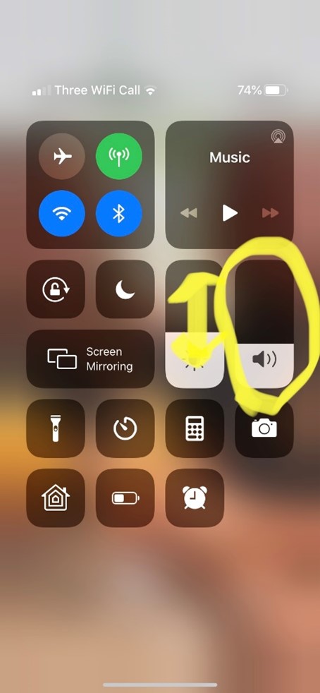The quickest way to check and adjust the volume level on your iPhone is by using the pull down quick menu that appears when slide your finger downward starting from the top right corner of your screen. (See pic below, left). Be sure to start from the corner, as starting more from the top middle of your screen will instead bring up the recent notifications. The quick menu will appear as shown in the picture below on the right. The ringer volume is circled, and you can adjust it by sliding up or down with your finger. Note, it will demonstrate the volume by playing louder or softer your chosen ringtone, so you might want to avoid doing this when you might disturb others.