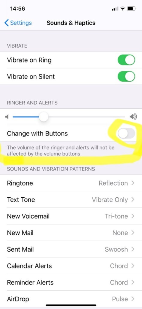 Then scroll down to “Sounds and Haptics” (see below left) and select by tapping. Look for the option “Change with Buttons” (see below right). If there is no green showing on that button, the ringer volume will not be affected by pushing the volume buttons on the left edge of the phone. If you do want to adjust the ringer volume with the side buttons, simply tap once on the “Change with Buttons” option, and you will see the green appear.