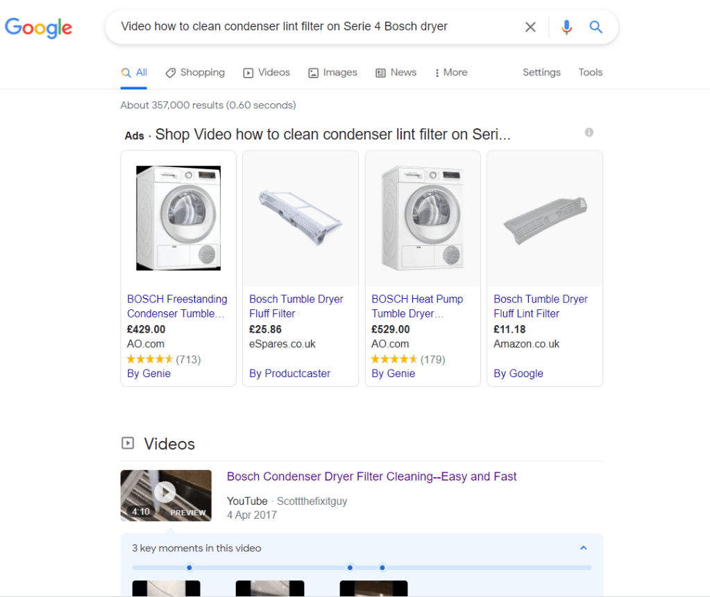 We type in “Video how to clean the condenser lint filter on a Bosch Serie 4 dryer”. Here you will want to be as specific as possible with the model as you don’t want to waste time viewing instructions that don’t pertain to your dryer. You may find that at the top of the page of search results you find “Google Shop” options (in the hopes you are actually planning to buy a Bosch dryer not already having bought one and will bring them a generous commission). Simply skip past the paid results, and you’ll find the videos just below (see image below).