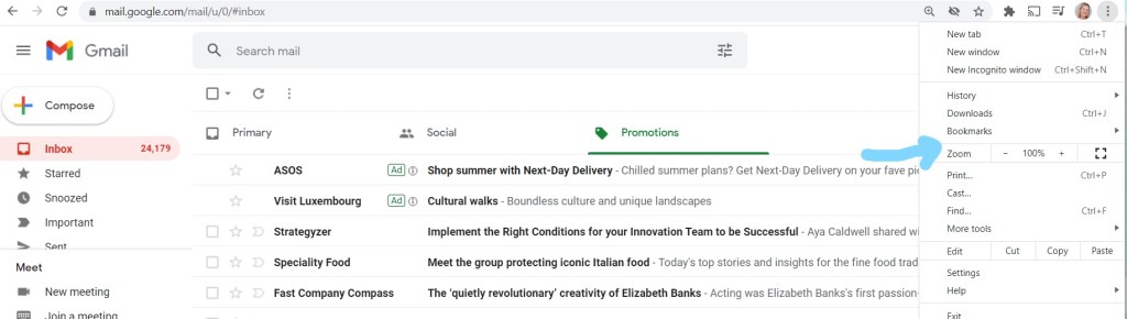 is by far the most used browser in which to view emails (Gmail, etc) and it provides the most flexibility in terms of font sizes, so we’ll start here. (If you prefer to change directly in Gmail or use Outlook, you’ll find instructions in the next sections of this post.)