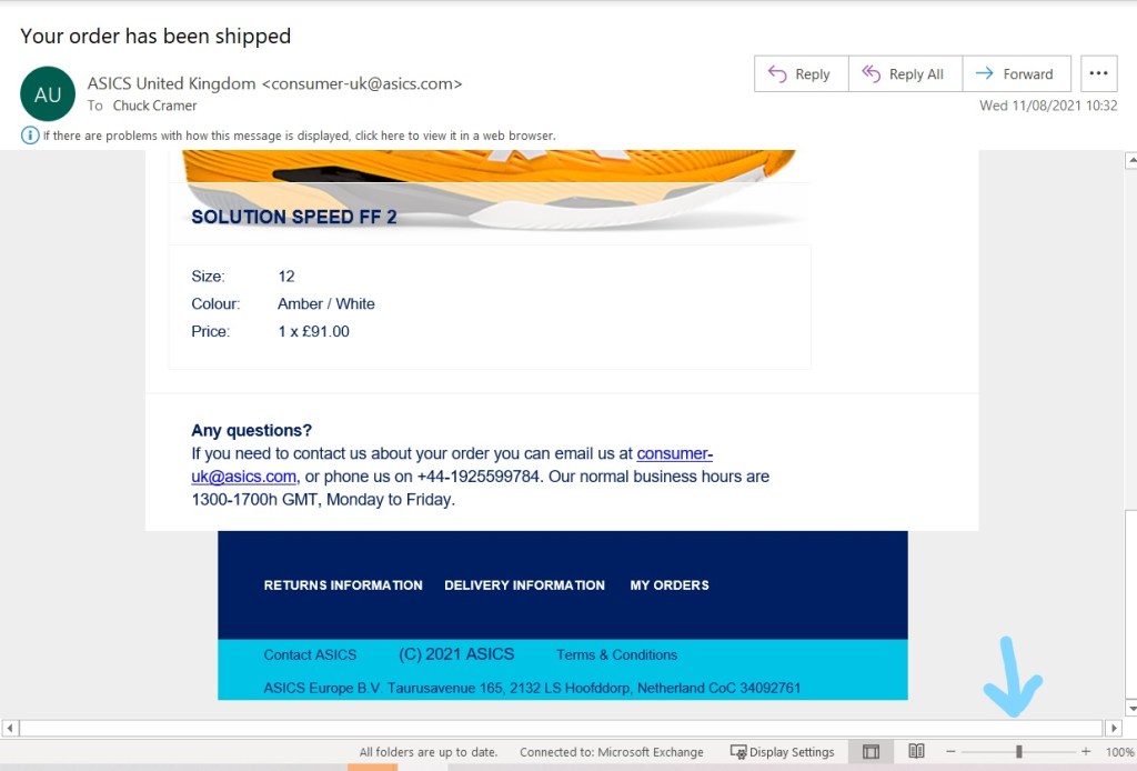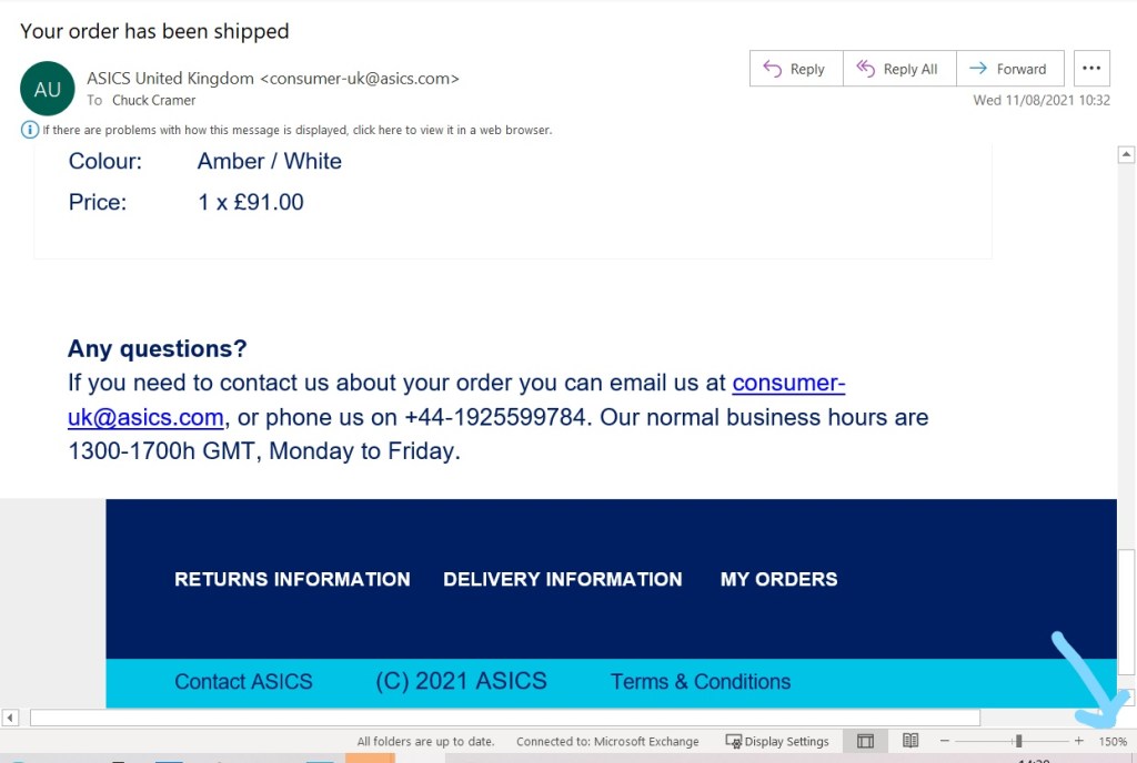 And when you open an individual email, here is what the difference looks like with the default 100% and 150%: