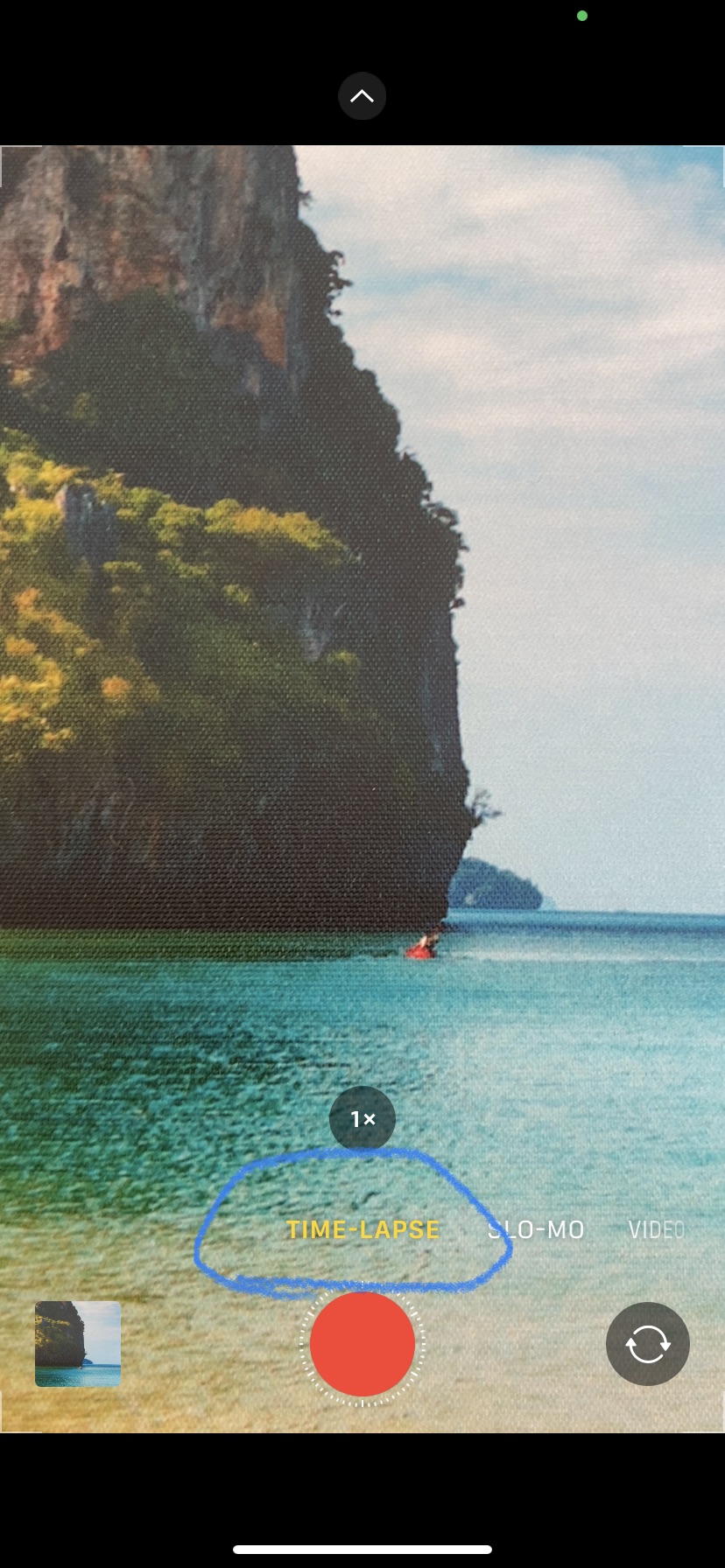 Scroll through the options above the red shutter button, and tap “Time-Lapse” (shown here circled in blue).