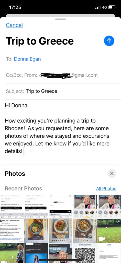 Once you tap “Insert Photo or Video”, your picture library will appear at the bottom of your screen (see below, left). Tap one or more images you’d like to insert and they will appear where in the email you had selected (see below, right). If you want the pictures to appear in different areas, say you are writing a description, inserting the corresponding picture then writing a separate description before you want an additional picture, then you will need to repeat the above process each time. (Or you can cut and paste the text afterward, but this can be fiddly on a small smartphone screen.)