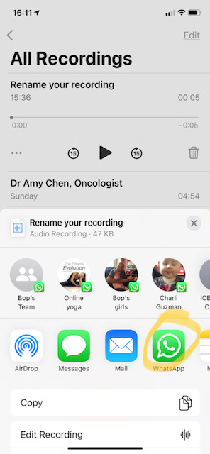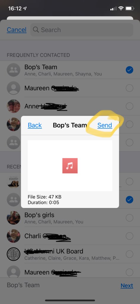 This will bring up the usual options where you can share the file. Remember that an advantage of sharing via WhatsApp is that all messages are encrypted, and you may appreciate the added security if you are sharing private medical information. WhatsApp will also be free. As mentioned in a previous post, sending files via text may or may not be free, depending on your service provider and package. We’ll use WhatsApp in this demonstration. You’ll see it appear in the options (below, left). Once you select it, find your recipient in the list. Once you tap them, the circle next to their name (or chat group name) will turn blue. The voice memo file will appear; look for the Send command in the top right (see below, right).