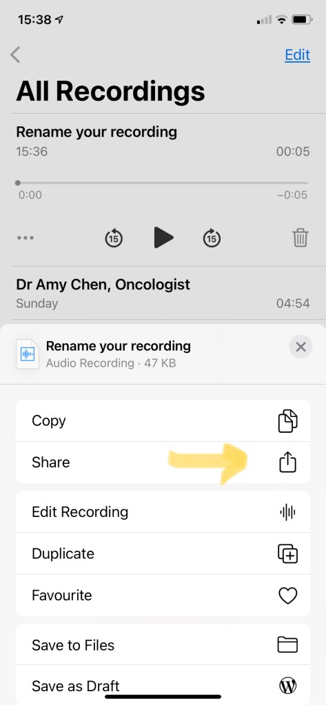 To share your voice recordings, go to the desired file and tap the ellipsis (three dots) on the left under the file name. See below, left. This will bring up several options including sharing the file. It’s here that you can also edit it, for example, cutting out any irrelevant parts before sharing. We can cover that in another post, and for now we’ll skip right to the part where you can share this recording with others. Choose the share icon. (See below, right).