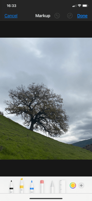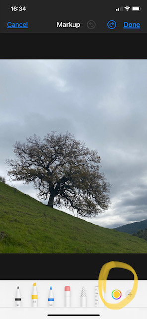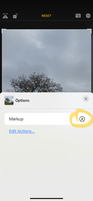 In addition to or instead of cropping, you may want to make other adjustments to your image. Here, we’ll look at adding text, and we’ll show you other edits in a later post (so be sure to subscribe at the end of this post so as not to miss those). To add text, choose the ellipsis (three dots) in the top right corner when in Edit mode (see below left, circled). This will bring up the (for now, only) option called “Markup”, see below right.