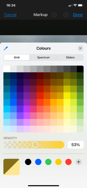 Once you tap “Markup” a set of pen and eraser options will appear at the bottom of your screen (below, left). The default one will be shown as raised slightly above the other options. To change the option, simply tap a different one. Tapping the one already raised will instead bring up options in terms of thickness/intensity of that chosen marker. To change the color of the chosen marker, tap the color circle (see below, right).