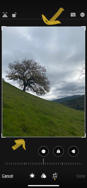 Tapping the crop symbol will add moveable borders to all edges and corners of your image (see below, with arrows top and bottom). Simply slide the desired border or corner with a finger until you achieve the desired crop. Don’t worry, at this stage you can simply move it again if you didn’t get it right the first try. For this demonstration we’ll cut out the branches of the tree on the right as well as some of the grassy area.