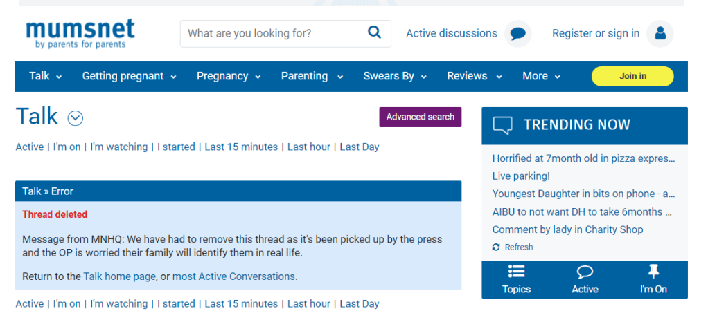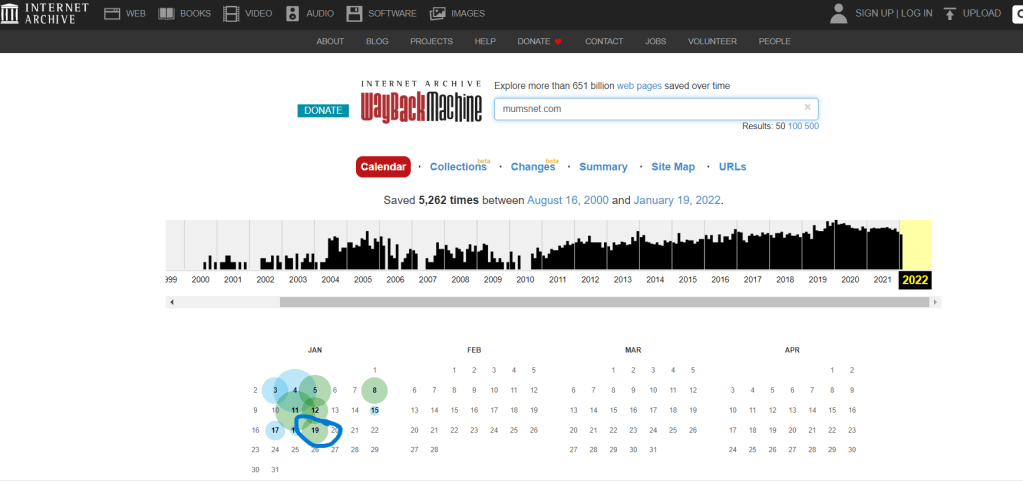 I have more success when I type the homepage address into the Wayback Machine. If I’m looking for a subpage, I then use the archived (old) homepage to navigate to the page I’m looking for. The archive is not a static snapshot, so this works, although they won’t necessarily have captured every page of every site. For the above example, I put in mumsnet.com and only once it had come up on the selected past date did I then use it to navigate to the section I wanted (in this case “Talk” and then “Am I Being Unreasonable” subsections).