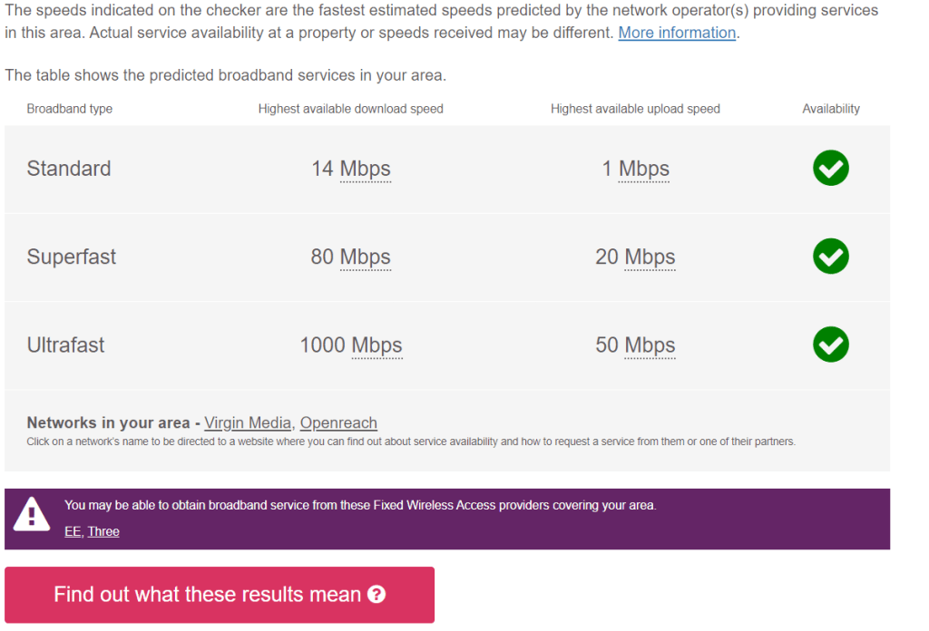 - However, on Ofcom’s site, you are able to check the different bands of speed available. The highest speeds are not available in all areas, with gaps especially in rural areas. You can check here and the output will look something like the below.