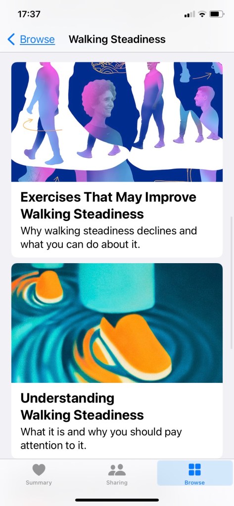 If you’ve set up notifications, you’ll also receive a warning when your steadiness is “low or very low”. But what can be done to improve matters? Of course the best course of action is to consult your doctor. And meanwhile, Apple has embedded some helpful exercises and other tips on improving your steadiness. Scroll down until you see the following articles and tap to open.