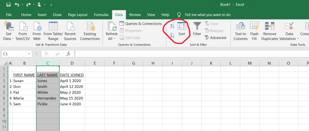 Excel will help you alphabetize any list or put in numerical order. In our example, say we now want to reconfigure the data alphabetically by last name. Click on the data in the column you want to sort (Last Name). In our example, you’ll click on the cell containing “C” above “Last Name”. Then click on the “Data” tab in your toolbar and look for the “Sort” option on the left. See below, left, with “Sort” circled in red.