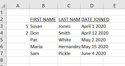 If you need to add more rows later, you simply grab a few rows above the empty cells to establish the pattern (eg “3,4,5”), place the cursor again on the bottom right corner of the last number grabbed (“5”) then drag and release once you’ve covered all the cells you want. There is no need to grab from the beginning, just enough entries to establish the pattern.