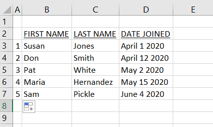 Sometimes you may have a list of data that is randomized, i.e. is not organized in order. Perhaps it’s a list of contacts you’ve been adding to as and when you receive them, but now you want to sort them in order and make presentable for sharing. Let’s use this simple unformatted list of names and dates to demonstrate a few shortcuts.