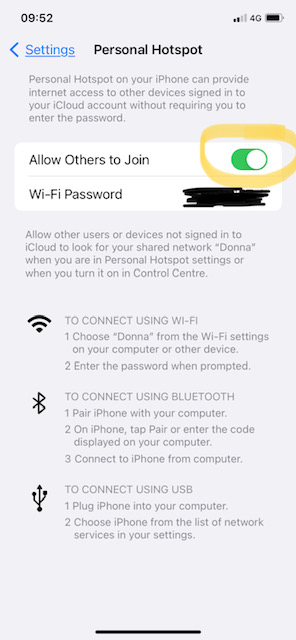 If you didn’t intend to share your data with others, you can easily switch off sharing your hotspot by going into Settings/Personal Hotspot and ensure that “Allow Others to Join” is not showing a green bar (see below). If it is, simply tap it to show grey. As using another’s hotspot requires knowing the 8-digit hotspot password, it’s unlikely a random stranger would have been able to consume your data, so there’s little to worry about in leaving it on.