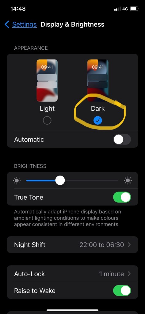 > Display & Brightness and tap the Dark theme under “Appearance” (see images below). This will automatically change the theme for built-in apps like Files, Messages, Music, News, Notes, Photos, Safari, and TV, as well as in some compatible third-party apps, such as Gmail. Others, like Facebook, will need to be switched on from its app. An example of what a text will look like is the third image, below.