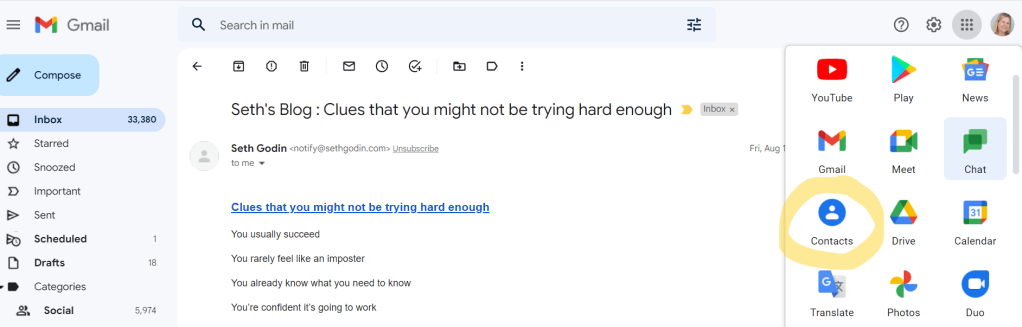 - Find Contacts in your Google menu. Look for 9 dots at top right of your screen (see 1st image below with yellow arrow). Tap it to get drop down menu and choose Contacts (circled below).