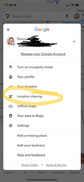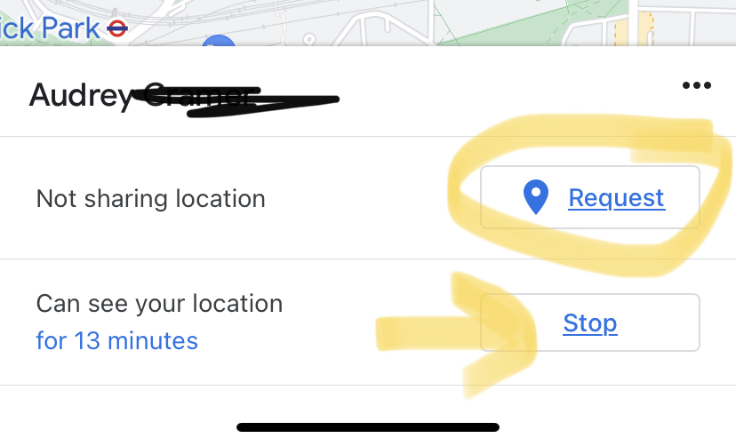 5) If, for example, you’re trying to meet up with each other or you are concerned with their safe arrival somewhere, after choosing the friend(s), you can also request that they share their location with you (circled below). You can also stop sharing your location (see arrow below), which you should do once not needed in order to avoid extra battery and/or data usage.