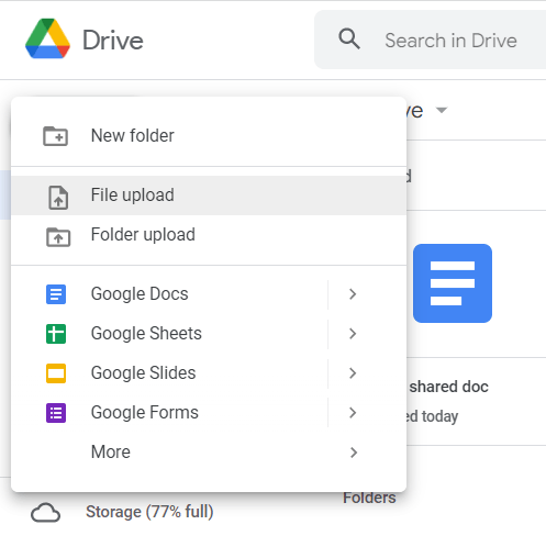 This will show a drop-down menu. For a single file, choose “File upload” (see below, hightlighted in grey).