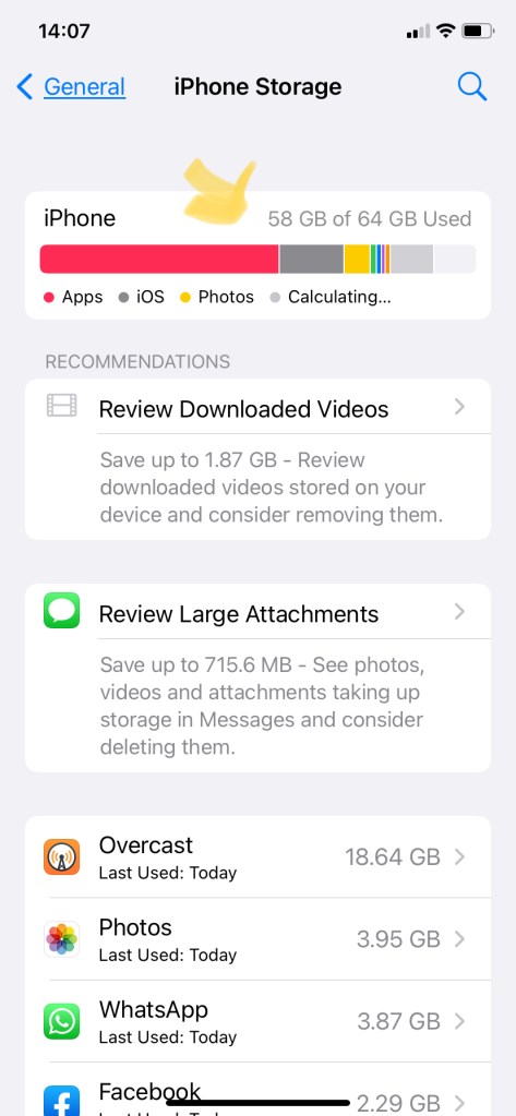 Now scroll down midway to iPhone Storage and tap. You’ll get an image like that below. The yellow arrow shows where you can see how much of your storage you’ve used and how much there is in total. The difference is how much you have left. So in the example below, I have (paid for) 64GB and used 58.6GB. You’ll start getting messages and having actions blocked a bit before it’s fully used. (I’d already freed up about 5GB of storage before taking this screenshot.)