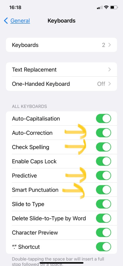 By default Auto-Correction should be on. If it’s not, turn on here whichever functions you wish to be included. You can pick and choose and always change back later if you’re finding something unhelpful.