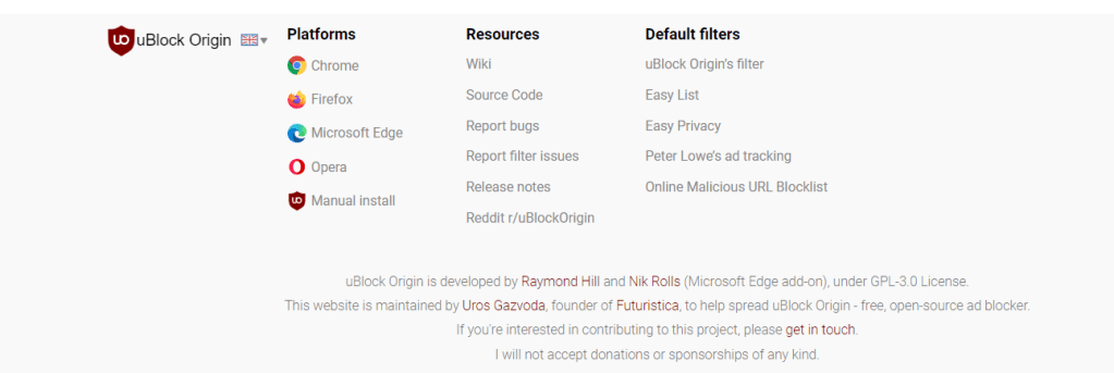 uBlock Origin specifically refuses donations, and instead advises all of its clients, users and supporters who would like to donate do so to block list maintainers. (Blocklist maintainers utilize email spam traps and user feedback to identify IP addresses, domain names, and email addresses that are sending unsolicited messages and spam emails. These are the “good guys” that help keep the Internet safe.)