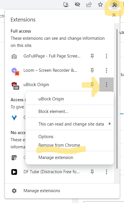 If you decide you no longer want to use this (or any other extension you’ve installed on your browser), simply tap the browser extension icon to the right of your web address bar (see below, circle top right). This will bring a drop-down menu of all your extensions. Select the one you want to uninstall (eg uBlock Origin), tap the ellipsis (3-vertical dots) menu (see yellow arrow below). Then select “Remove from Chrome” (underscored in yellow below).